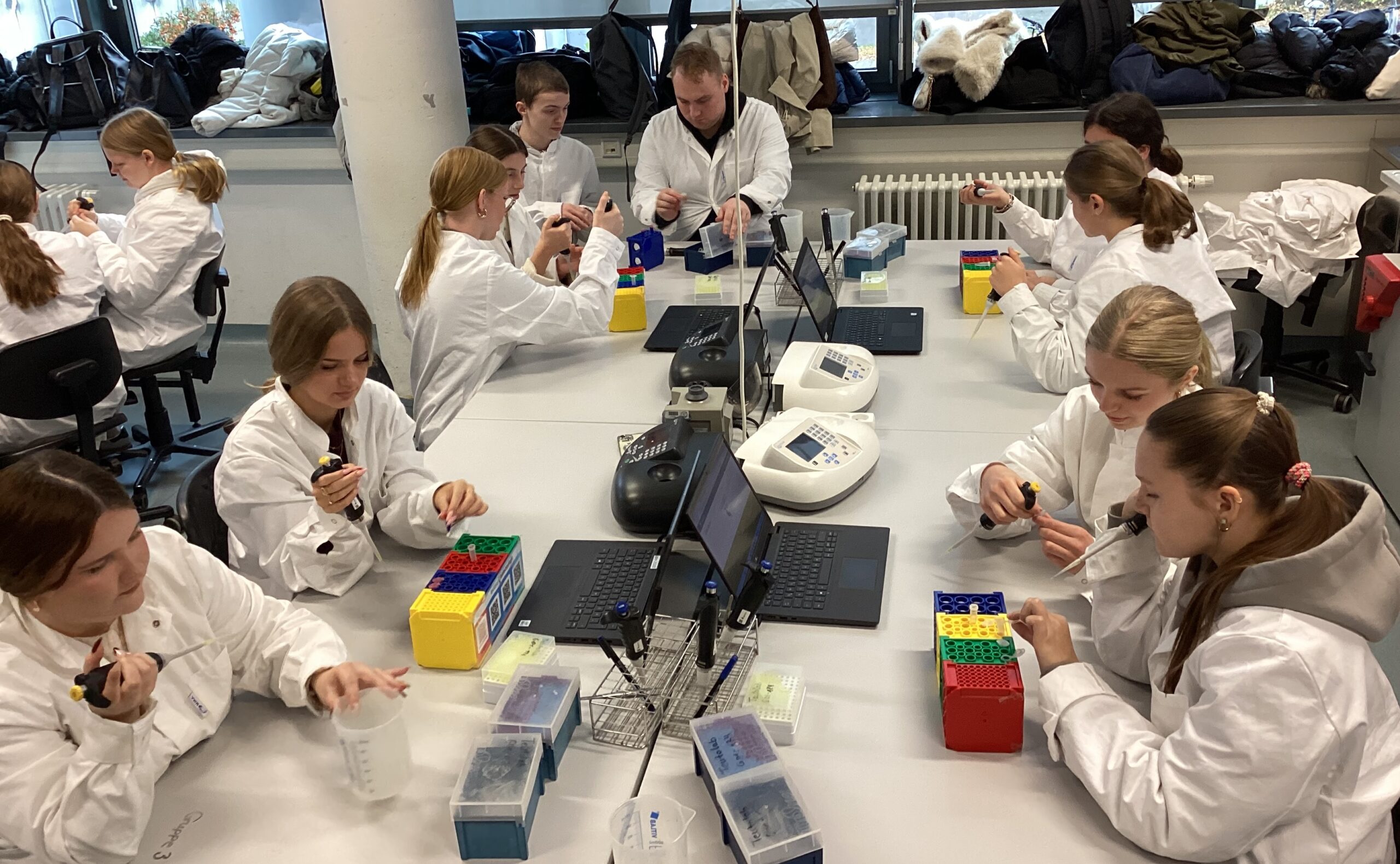 Unsere 13er-Biologen im Schülerlabor an der Uni Bielefeld beim Experimentierkurs "Was ist in der Wurst?“