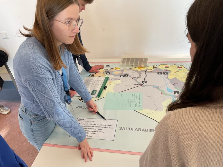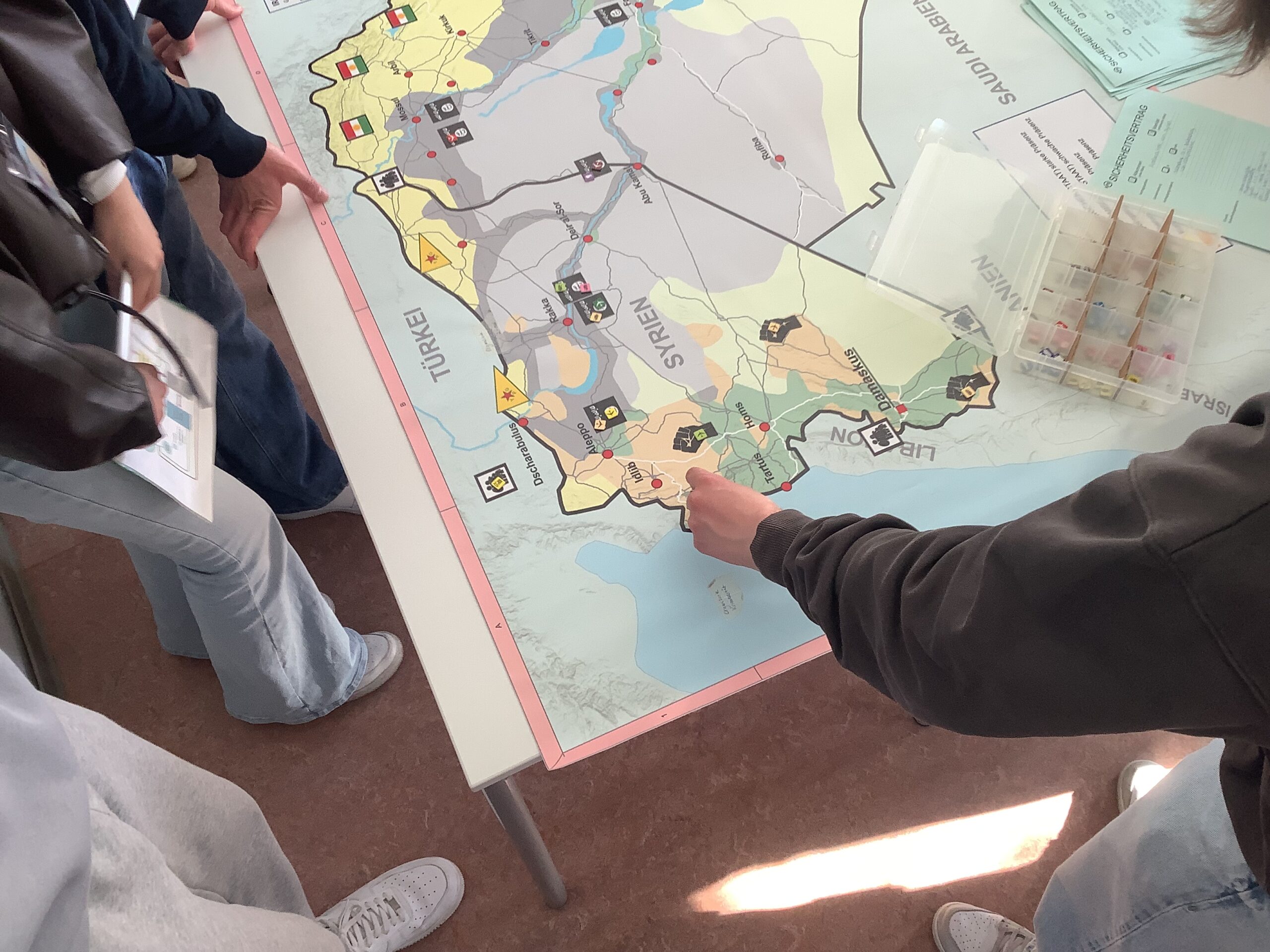 Am Montag, den 09.02.25, wurde von zwei Offizieren der Bundeswehr ganztägig im Zusatzkurs Sowi ein Planspiel zum Syrienkonflikt (Konfliktplanspiel "KPS") durchgeführt. Die 42 SuS aus dem Kurs wurden in zwei Gruppen eingeteilt und spielten den Konflikt um Syrien aus Sicht von UN-Generalversammlung und UN-Sicherheitsrat nach. Die Ausgangslage spielt im Jahr 2014, wobei sich die verschiedenen regionalen Gruppen (z. B. der IS, die syrischen Rebellen sowie die Truppen von Baschar al-Assad) bekämpfen. Entscheidungen der SuS, die in der Rolle von Vertretern aus USA und Russland sowie den Nachbarstaaten Einfluss auf den Verlauf des Konflikts nahmen, konnten die SuS dadurch auf reale politische Ereignisse übertragen.